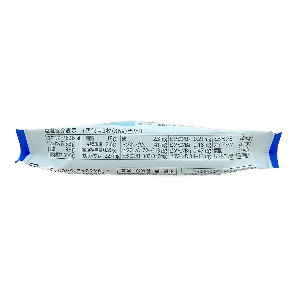 1個包装2枚(36g)当たり/エネルギー:180kcal、たんぱく質:3.3g、脂質:9.9g、炭水化物:20.6g、糖質:18g、食物繊維:2.6g、食塩相当量:0.20g、カルシウム:227mg、鉄:2.3mg、マグネシウム:41mg、ビタミンA:72~213μg、ビタミンB1:0.07~0.47mg、ビタミンB2:0.21mg、など