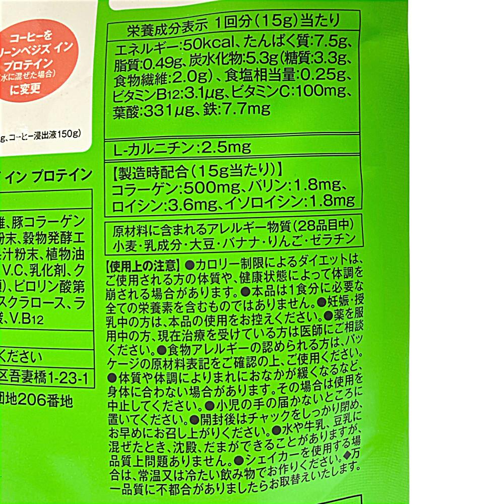 大豆蛋白(国内製造)、砂糖、水溶性食物繊維、豚コラーゲンペプチド(ゼラチンを含む)、野菜・果実混合粉末、穀物発酵エ キス末(小麦を含む)、バナナ粉末、りんご果汁粉末、植物油脂、L-カルニチンL-酒石酸塩/トレハロース、V.C、乳化剤、クチナシ色素、香料(乳由来)など