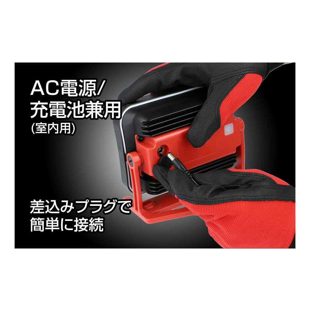 コンパクトな投光器、底面マグネット付き。 内蔵充電池でも、コンセントからの給電でも使用可能