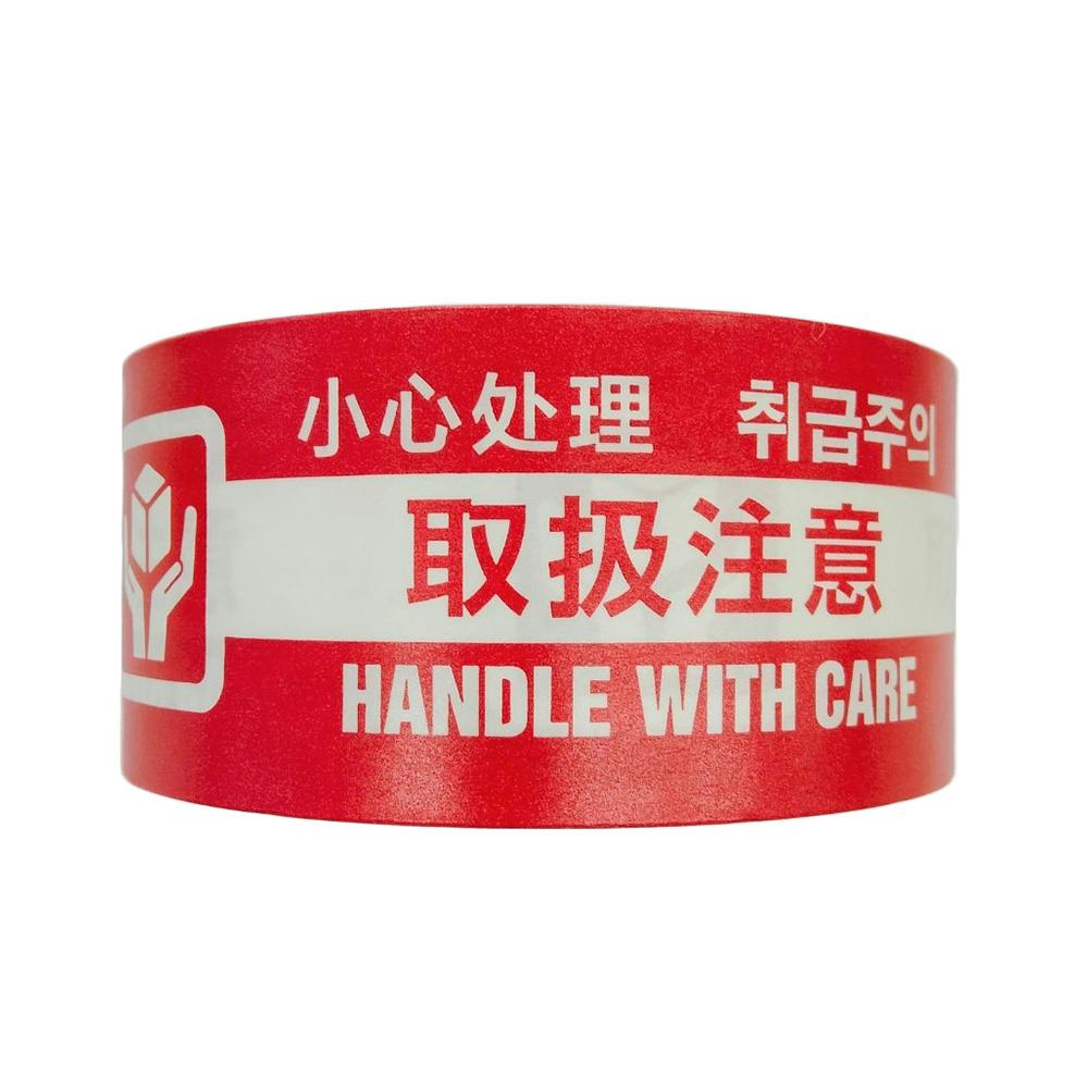 流通・小包み・引越しなどの荷姿を表示する包装用テープです。輸出入に対応する4ヶ国語で表示されています。