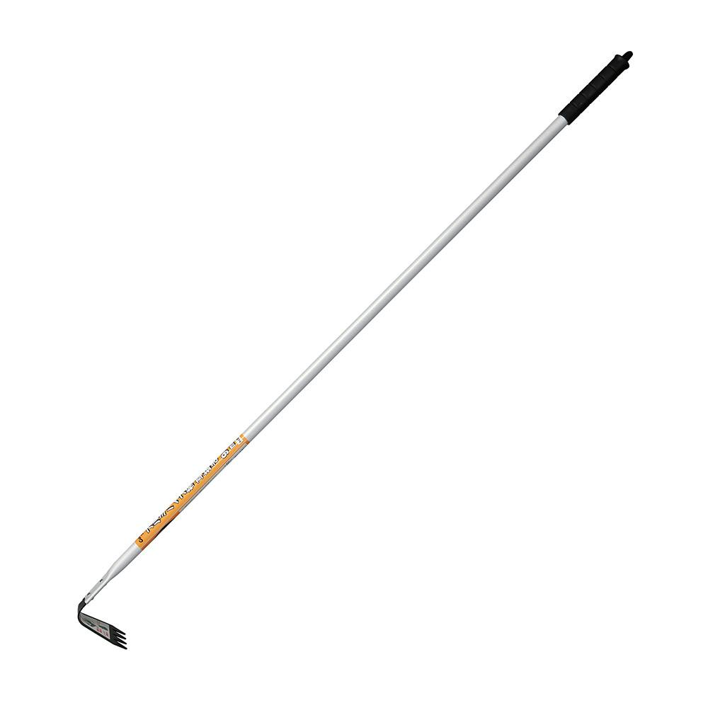しつこい雑草の抜き刈りに便利な側面刃付熊手タイプ、水田のヒエ抜きに最適、長柄で立ったまま楽に草抜きできる