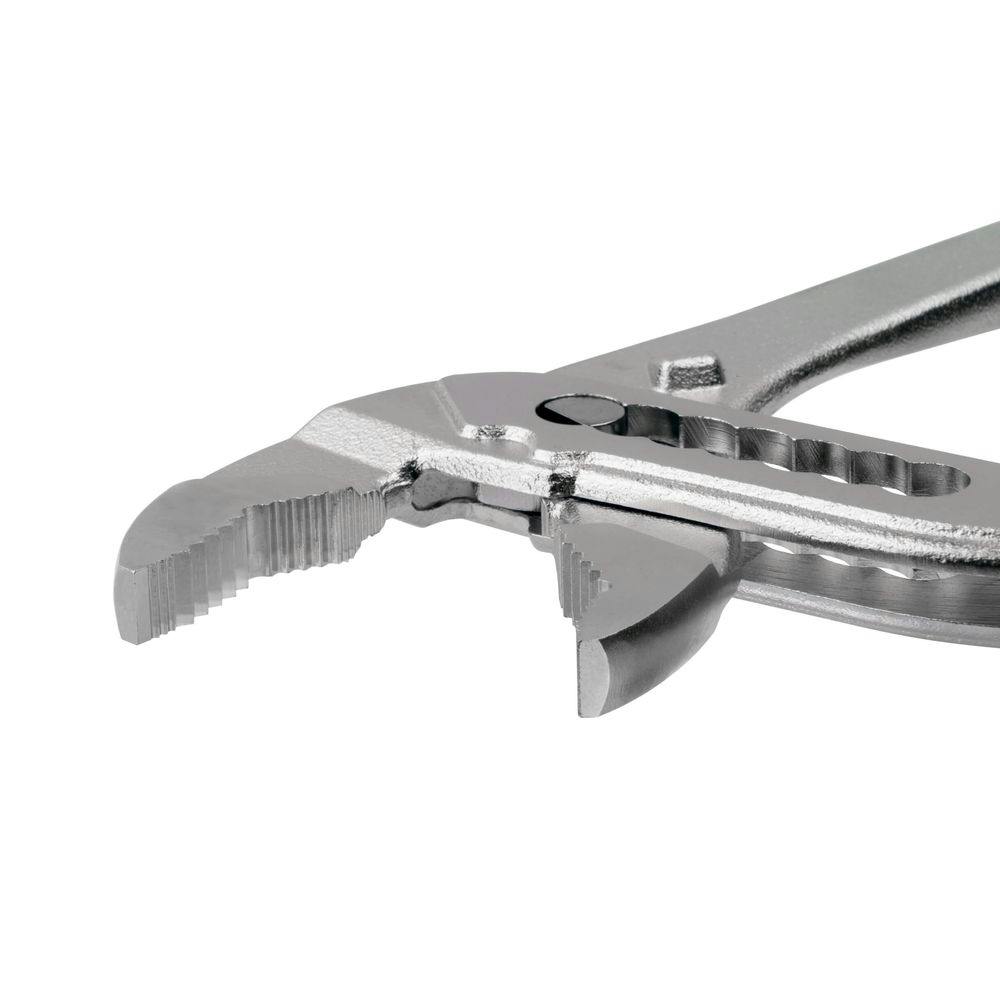 ・2つの本体を差し込んで組み、ジョイントすることで高剛性、高耐久性構造となっています。・スリムな先端とフラット形状。ボルトが出っ張らず狭い箇所に入り込む。・ニッケルクロムメッキ仕上げにより、サビに強く水廻りの作業でも使用可能