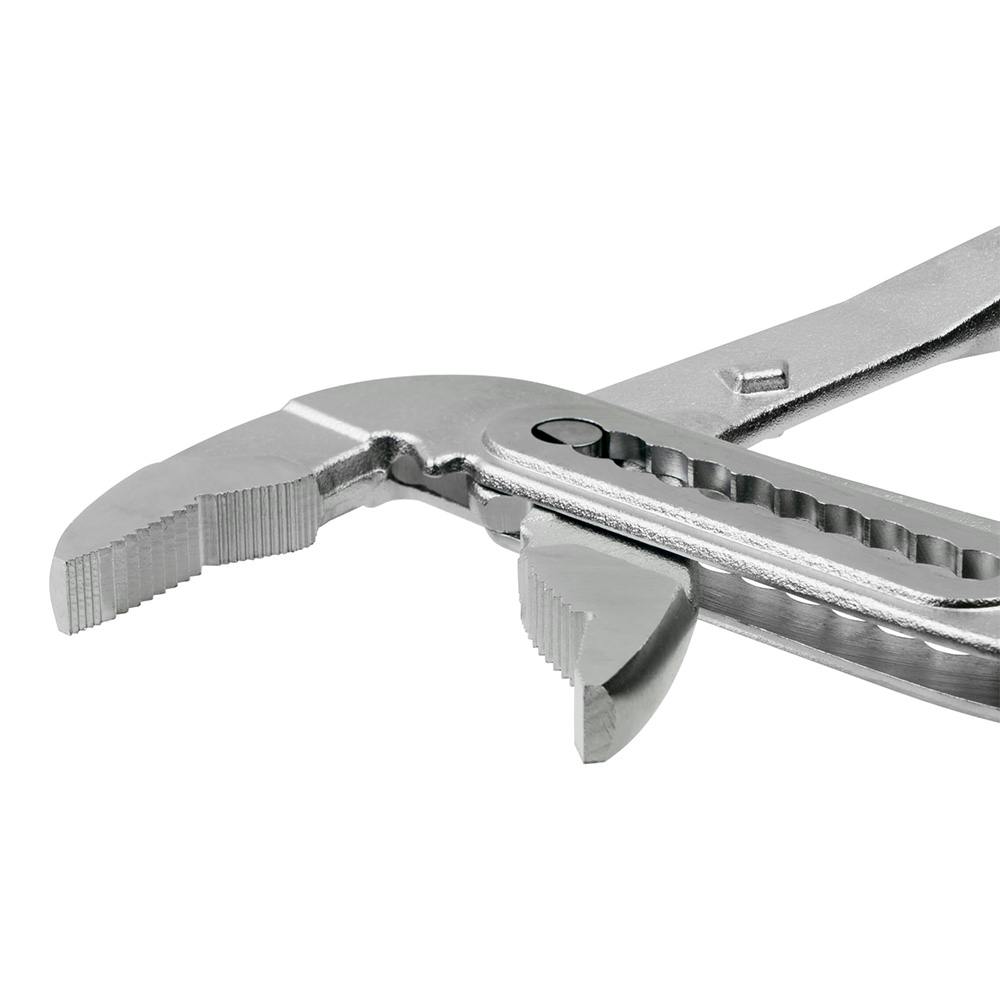 ・2つの本体を差し込んで組み、ジョイントすることで高剛性、高耐久性構造となっています。・スリムな先端とフラット形状。ボルトが出っ張らず狭い箇所に入り込む。・ニッケルクロムメッキ仕上げにより、サビに強く水廻りの作業でも使用可能