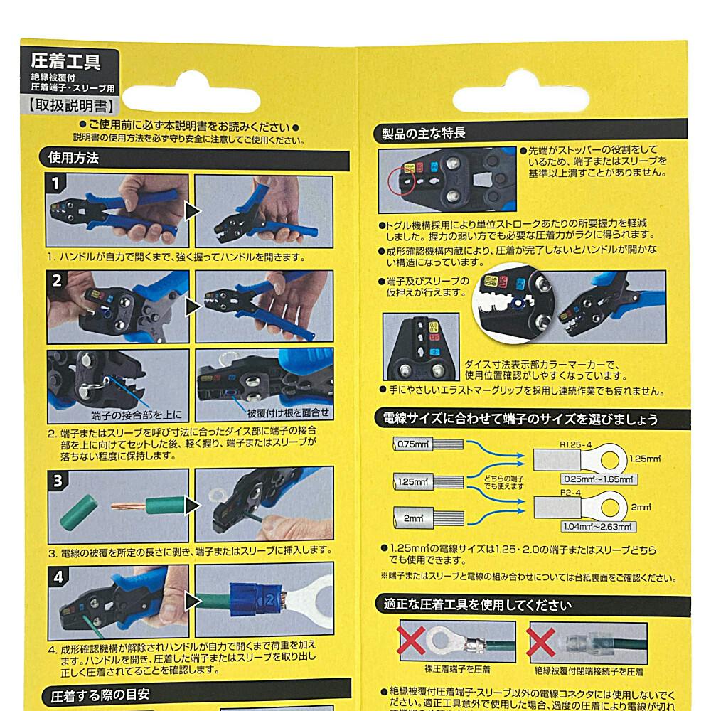 ●この工具は絶縁被覆付圧着端子、絶縁被覆付圧着スリーブ用です。●活線の圧着は危険です。絶対にしないでください。●線材に適合する端子またはスリーブをお使いください。適合してないと圧着不良により機器の故障や火災の原因になります。など