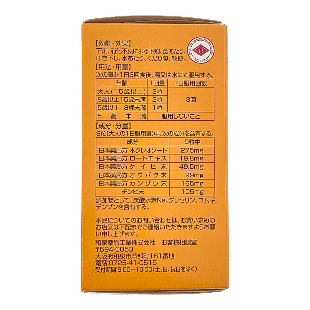 9粒中日局木クレオソート・・・275mg日局ロートエキス・・・19.8mg日局ケイヒ末・・・49.5mg日局オウバク末・・・99mg日局カンゾウ末・・・165mgチンピ末・・・105mg