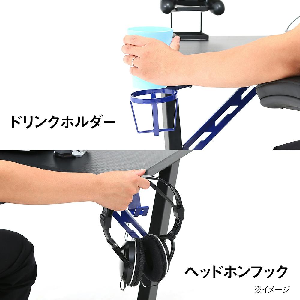 デザインが特徴的な多機能デスク。ドリンクホルダー、ヘッドホンフック、タブレットスタンド、コントローラースタンド。