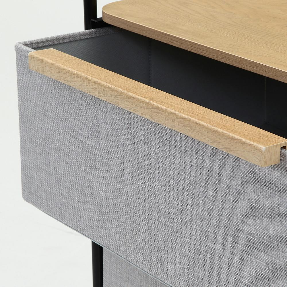 ●構造部材(フレーム)/金属(鋼) ●表面加工(フレーム)/エポキシ樹脂塗装 ●天板/合成樹脂化粧繊維板(PVC) ●側面/ポリエステル、繊維板 ●収納部分/ポリエステル(リネン風生地/不織布)、紙 ●取っ手/合成樹脂化粧繊維板(PVC)