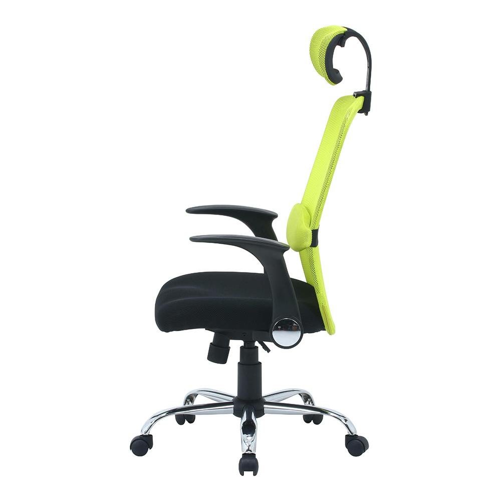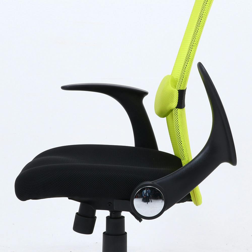 ヘッドレストとランバーサポートが付いたシンプルデザインのオフィスチェア。アームが上がるから省スペースでチェアをデスクに収納可能。