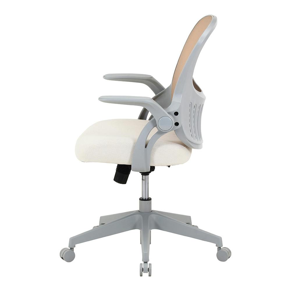 座面の奥行を狭くして女性も座り易い設計のオフィスチェア。クッション性の高い厚座タイプでロッキング機能付き。アームが上がるから省スペースでチェアをデスクに収納可能。