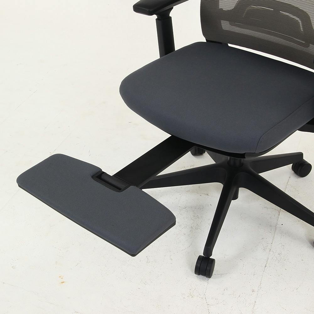 フットレストが付いた多機能オフィスチェア。ヘッドレスト、可動ランバーサポート、昇降肘置きにより座る人に合わせた調整が可能。座面にはクッション性と耐久性に優れたモールドウレタンを使用。