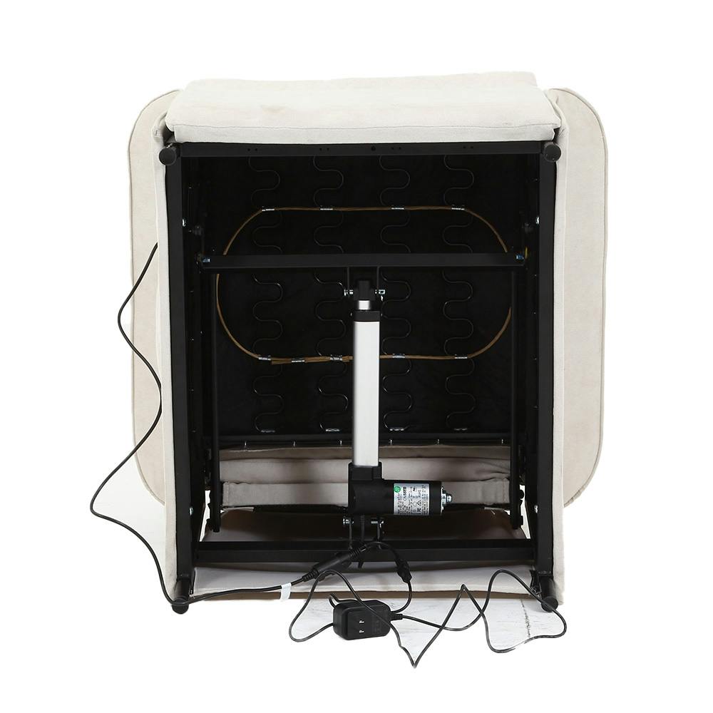 手元のリモコンでリクライニングが出来る電動一人掛けソファ。リクライニングはフラットに近い150°まで可能。フットレストはリクライニングと連動して可動。