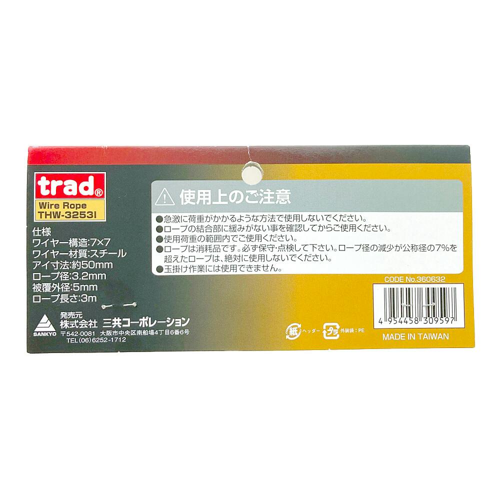 trad PVC被覆メッキ付ワイヤーロープ アイ加工3.2×5 3m THW-3253I