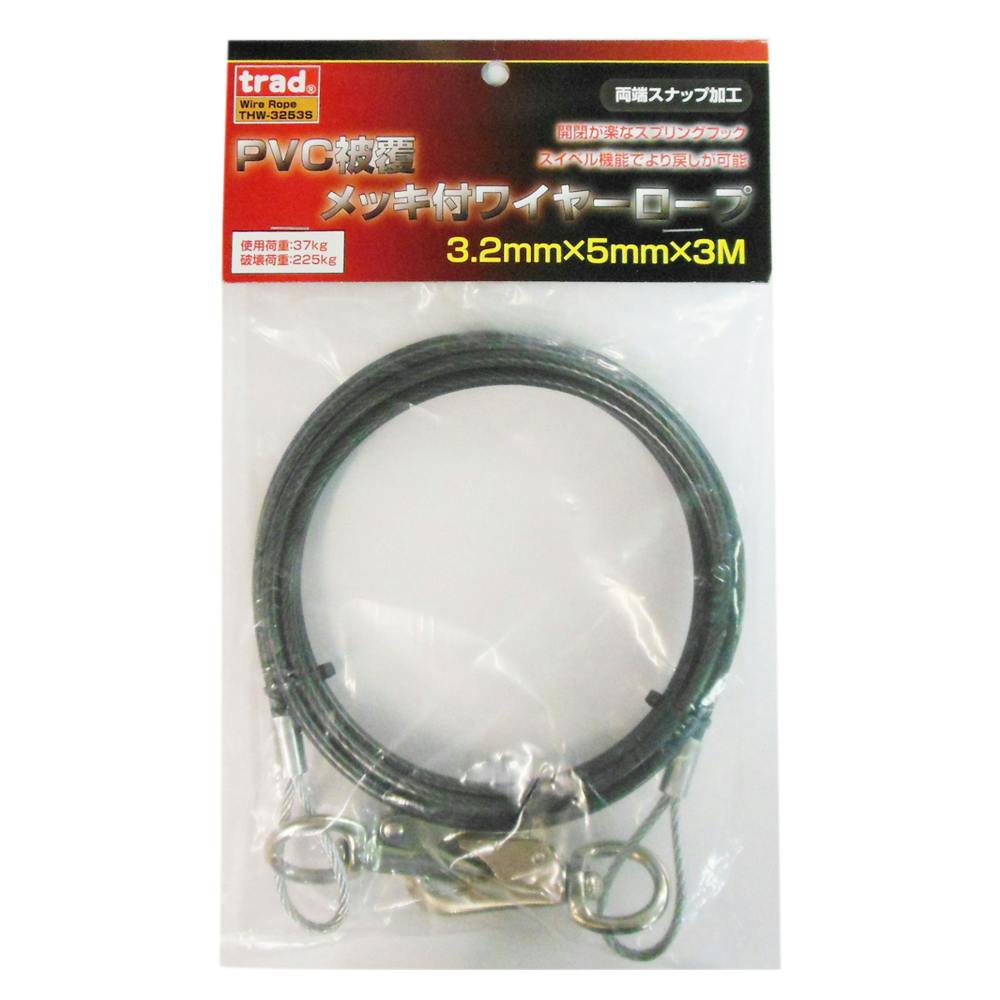 trad PVC被覆メッキ付ワイヤーロープ 両端スナップ加工 THW-3253S 3.2×5 3m