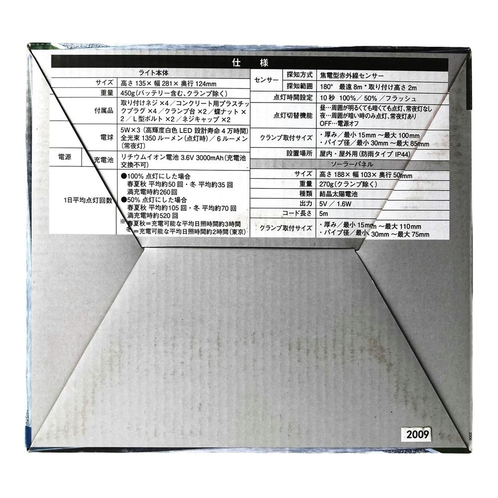●本体は大量の水がかかる場所には設置不可 ●家電製品には近づけない ●逆さまの取付不可●ご購入時は充電が不十分です。晴天の日に電源スイッチをOFFにして約2日間充電した後、使用して下さい。