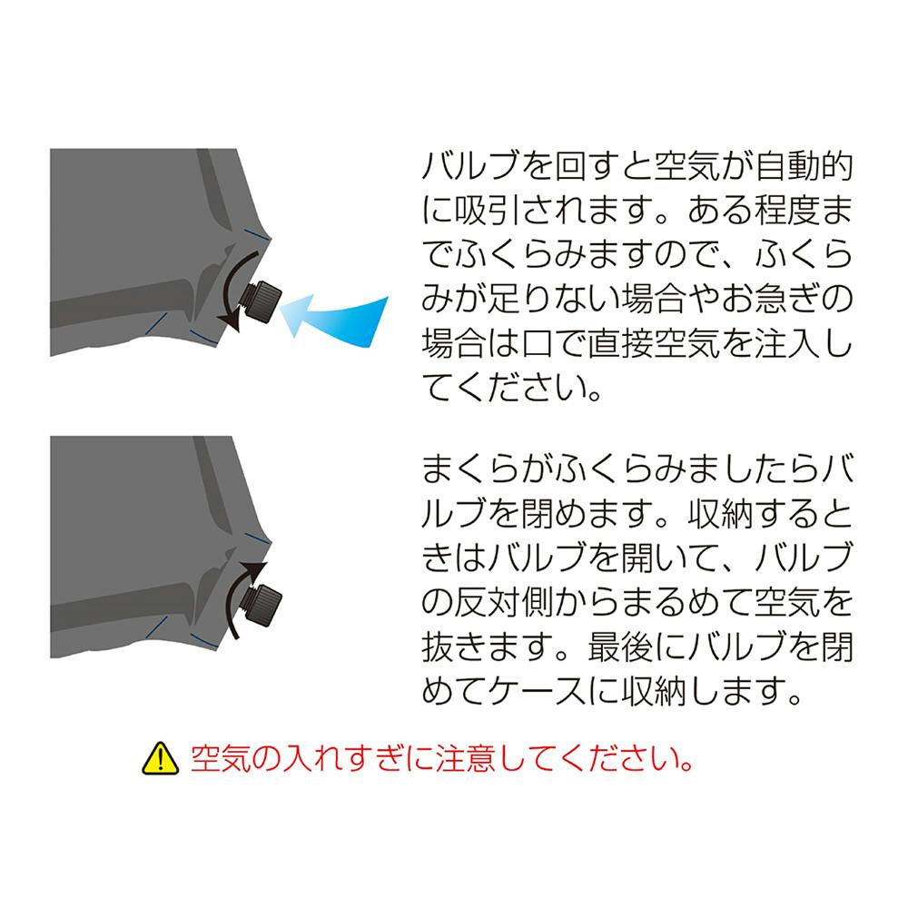 バルブを開くと自動的にふくらむまくら。バルブを回すと空気が自動的に吸引されます。 ある程度までふくらみますので、ふくらみが足りない場合やお急ぎの場合は口で直接空気を注入してください