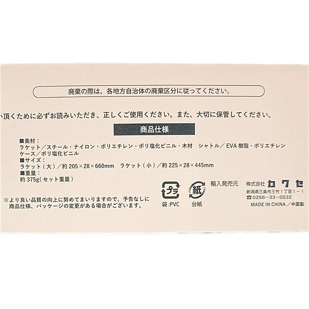 ●ラケット/スチール・ナイロン・ポリエチレン・ポリ塩化ビニル・木製 ●シャトル/EVA樹脂・ポリエチレン ●ケース/ポリ塩化ビニル