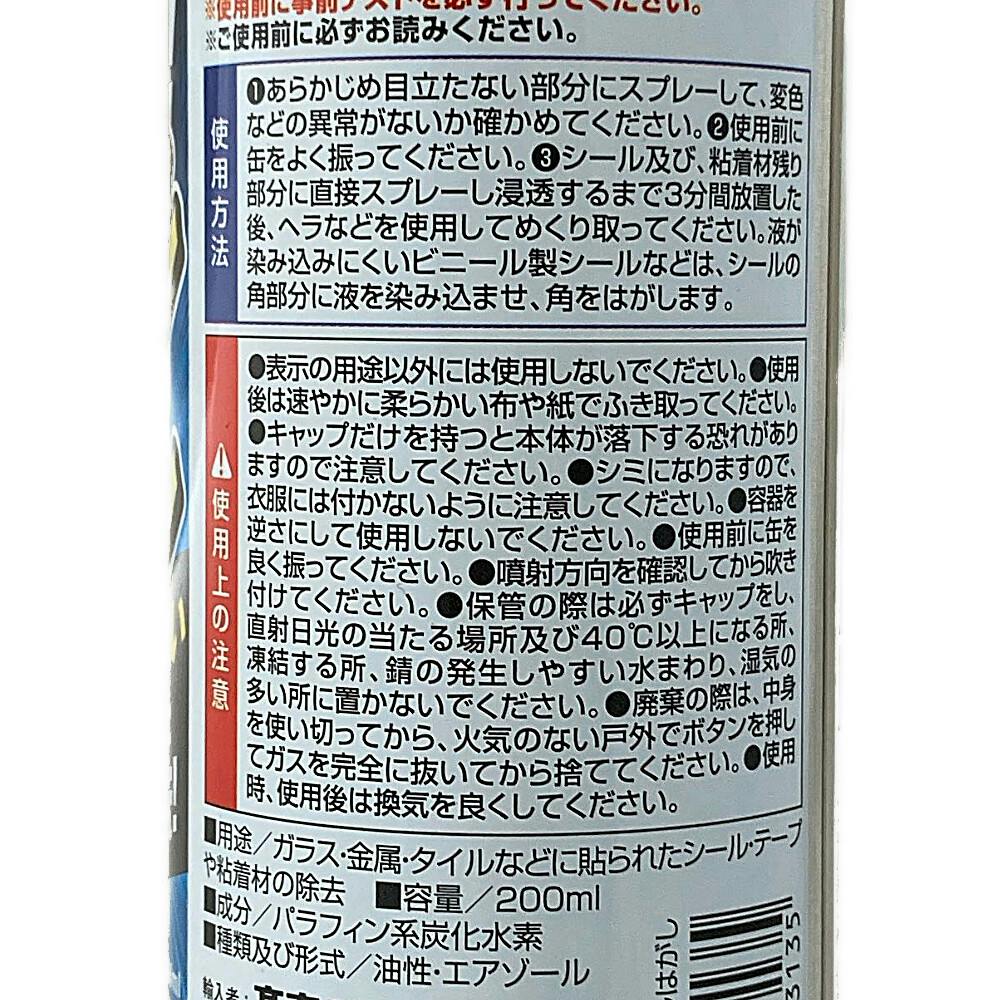 ●使用前に缶をよく降って下さい。●シール及び、粘着材残り部分に直接スプレーし浸透するまで、3分間放置した後、ヘラ等を使用してめくり取って下さい。