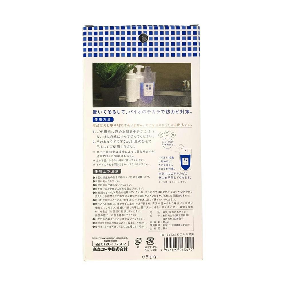 1、使用前に袋の上部を中身がこぼれない様に点線に沿って切ってください。2、そのまま立てて置くか、付属のひもで吊るしてご使用下さい。3、カビ予防効果は環境によって異なりますが、通常約3ヶ月間継続します。