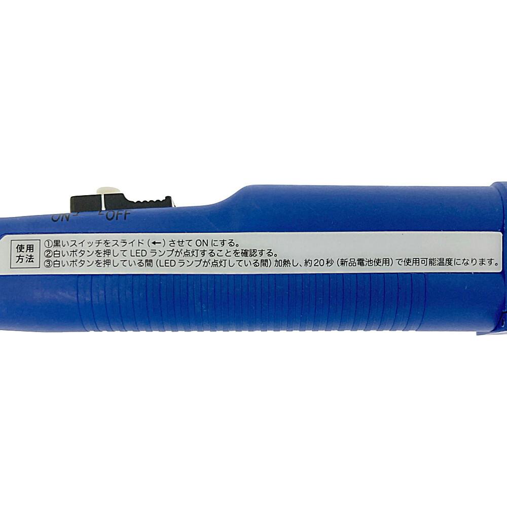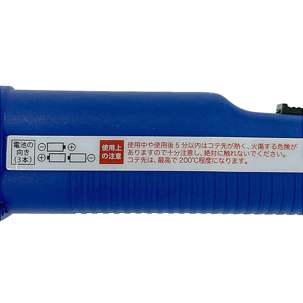 ●コテ先とそれに続く金属部は200℃以上の高温になります。●用途以外には使用しないでください。●塗装した木製品や塩ビ材など熱に弱い素材には使用できません。●使用中に熱くなりすぎた時は直ちに使用を中止し、電池を抜いてください。