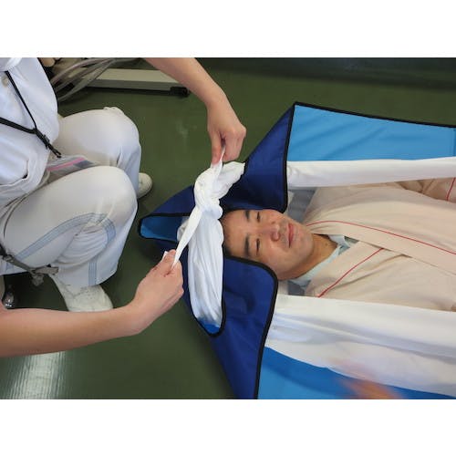 担架マット(幅91cm×長さ180cm)の中心部に、厚さ10mmウレタン素材を6枚、真ん中2枚にさらに厚さ0.7mmの強化板(樹脂板材)を底面側に貼り付けています。