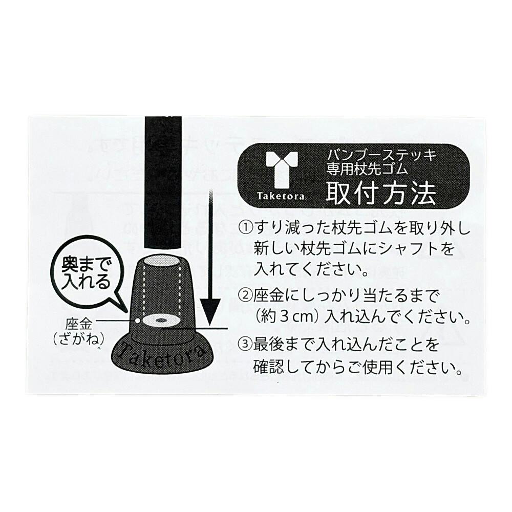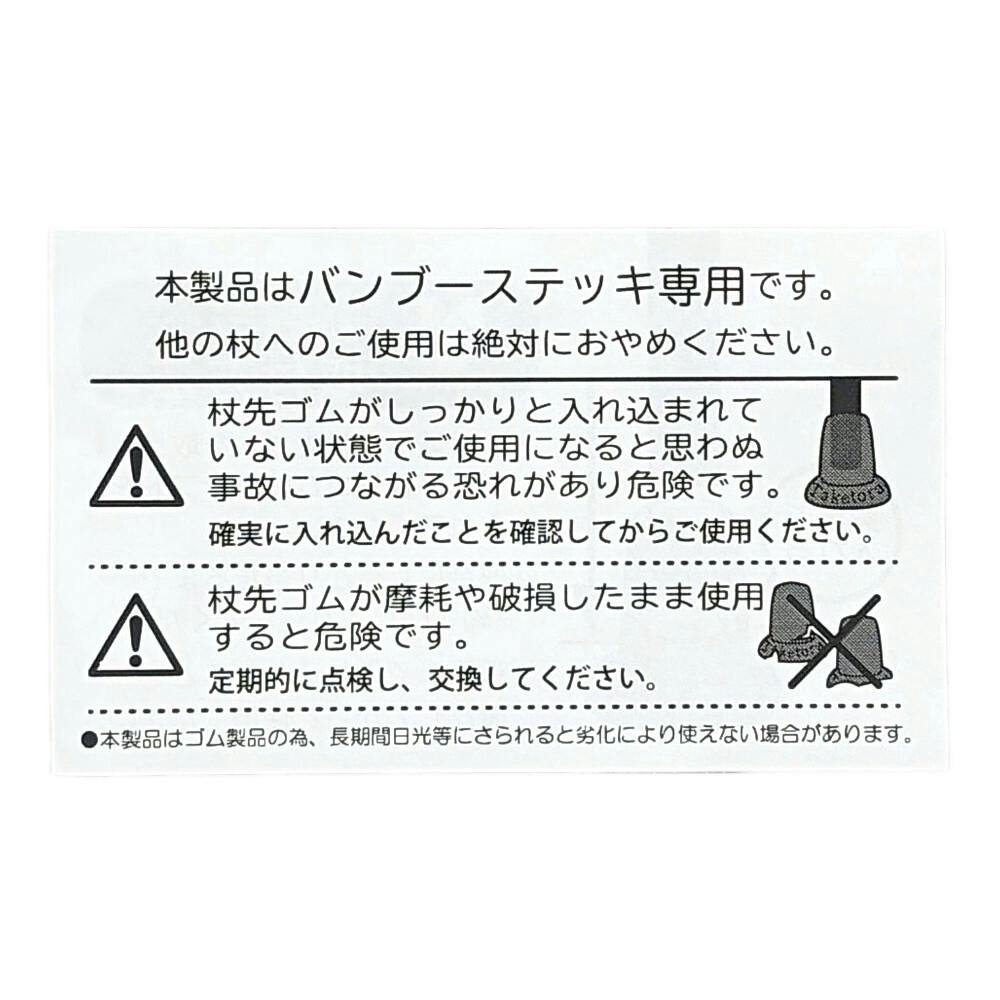 ●本製品はバンブーステッキ専用です。他の杖へのご使用は絶対におやめください。●杖先ゴムがしっかりと入れ込まれていない状態でご使用になると思わぬ事故につながる恐れがあり危険です。確実に入れ込んだことを確認してからご使用ください。など