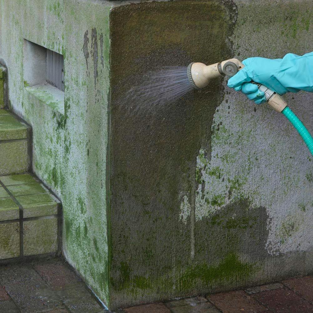モルタル、コンクリート、ALC、ブロック、タイル表面に発生した藻、コケ、カビを落す。