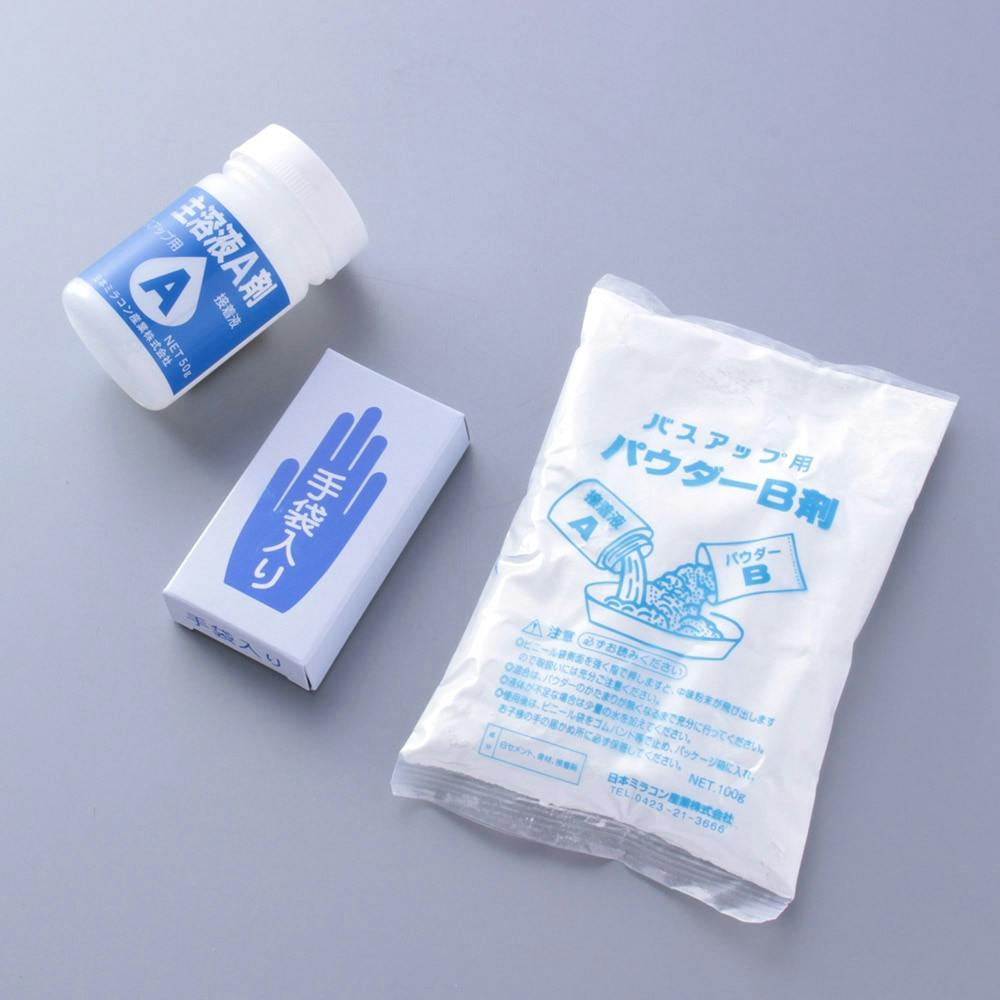 丸主溶液A剤:水溶性接着液、ヒビ割れ防止剤、防水剤 ●パウダーB剤:石灰石、粘土、鉱さい、石膏、骨材、ヒビ割れ防止剤