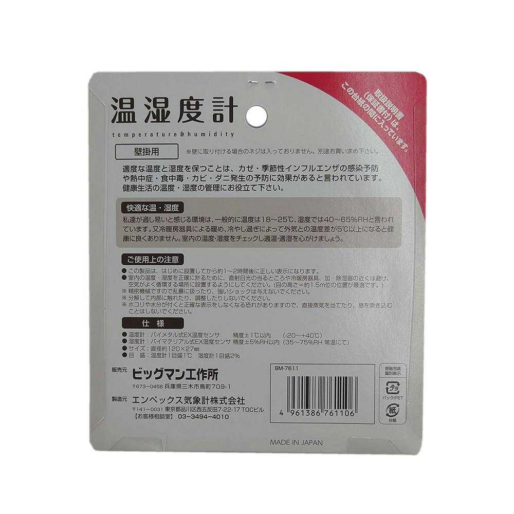 ●目盛:温度計1目盛1℃ 湿度計1目盛2%。 ●温度計:バイメタル式EX温度センサ 精度±1℃以内(ー20~+40℃) ●湿度計:バイマテリアル式EX湿度センサ 精度±5%RH以内(35~75%RH常温にて)