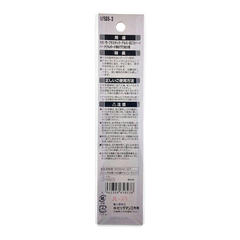 ビッグマン Bigman 六角軸ハイス下穴テーパードリル ショートタイプ MSDS-3 4mm