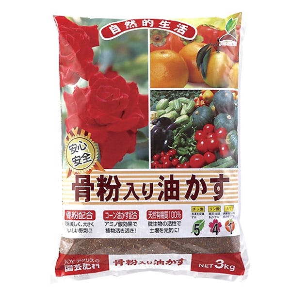 骨粉、菜種油かす、コーン胚芽油かす配合。有機質100%肥料。
