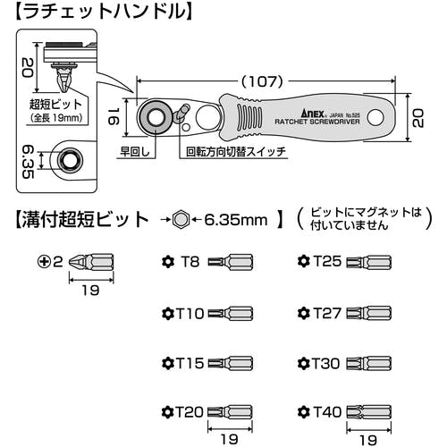• 【CAINZ-DASH】アネックスツール コンパクトビット・ラチェット52 超短ヘクスローブビットセット ストレート型 525-9T【別送品】