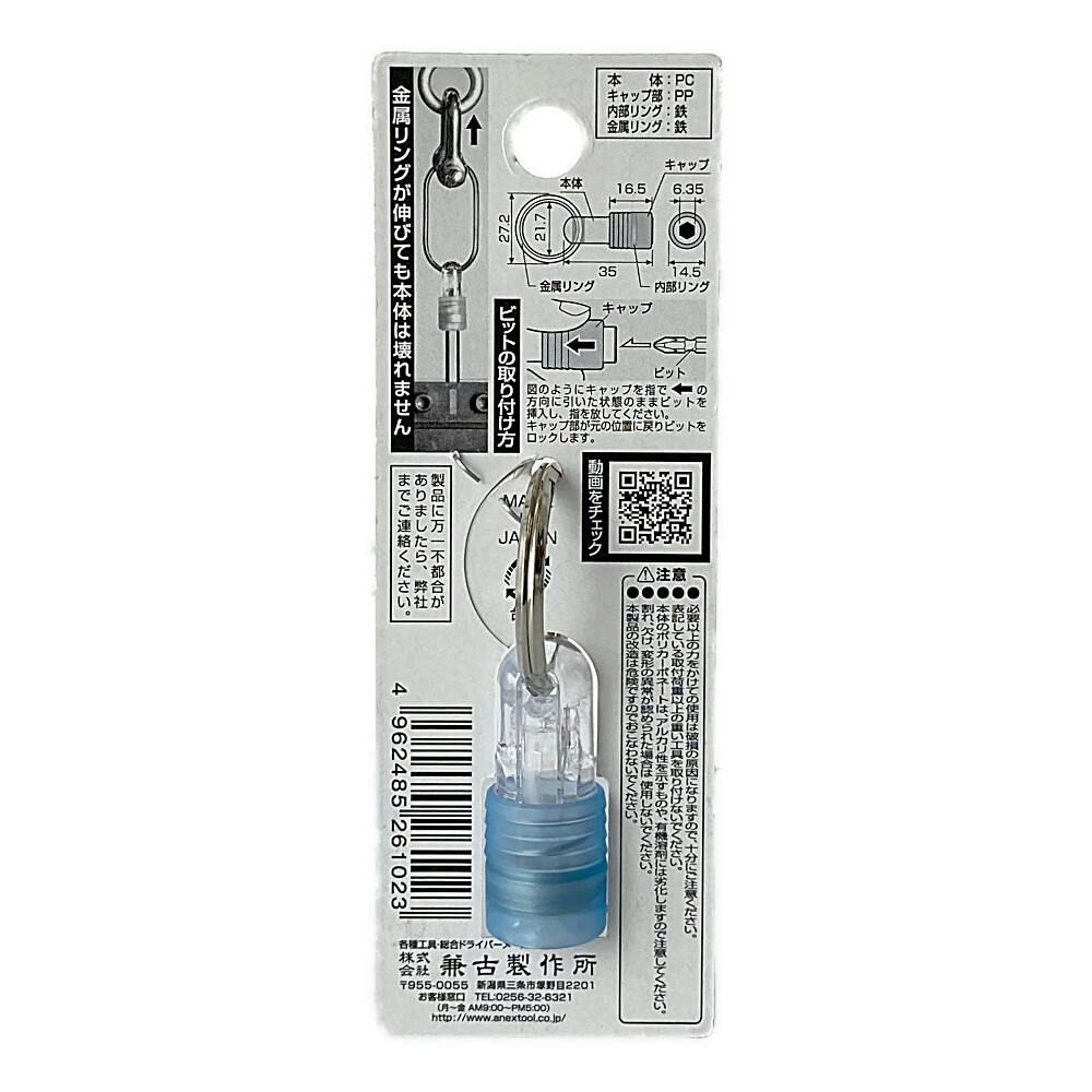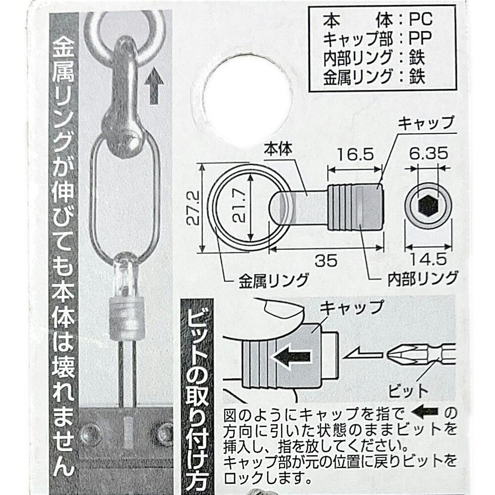 ●金属リングが伸びても本体は壊れません●ビットの取り付け方/商品パッケージ裏面記載図のようにキャップを矢印の方向に引いた状態のままビットを挿入し、指を放してください。キャップ部が元の位置に戻りビットをロックします。