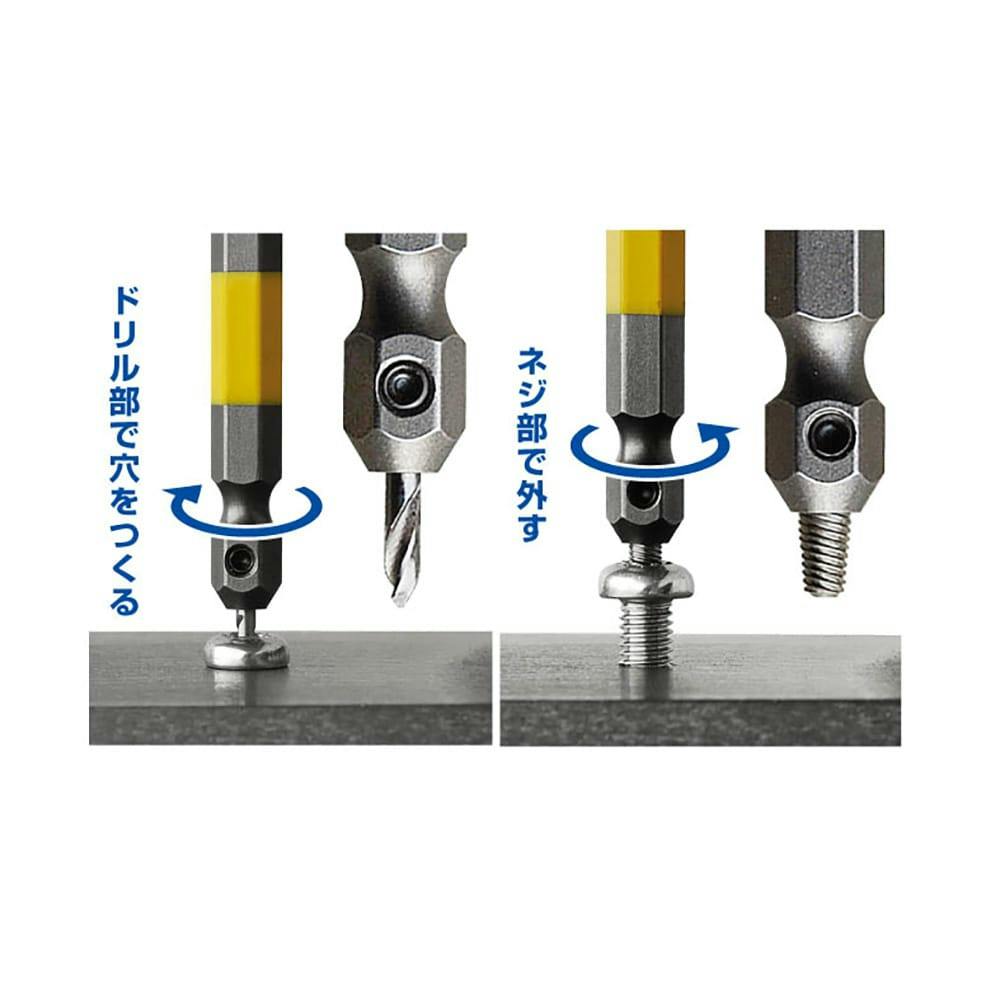 ●電動ドライバーを使ってビット1本で穴あけと抜き取りができます。 ●ステンレスネジ用切削オイル付き ●先端のドリル、ネジ部品は消耗したら交換できます。 ●スペアドリル、スペアネジ部品、各1本付