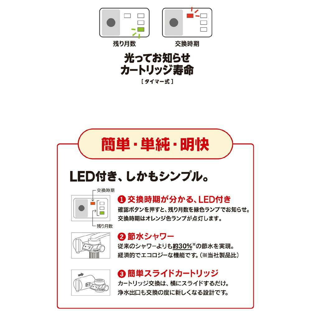●簡単・単純・明快●LED付き、しかもシンプル。●交換時期が分かる、LED付き/確認ボタンを押すと、残り月数を緑色のランプでお知らせ。交換時期はオレンジ色ランプが点灯します。●節水シャワー/従来のシャワーよりも約30%(※当社製品比)の節水を実現。等