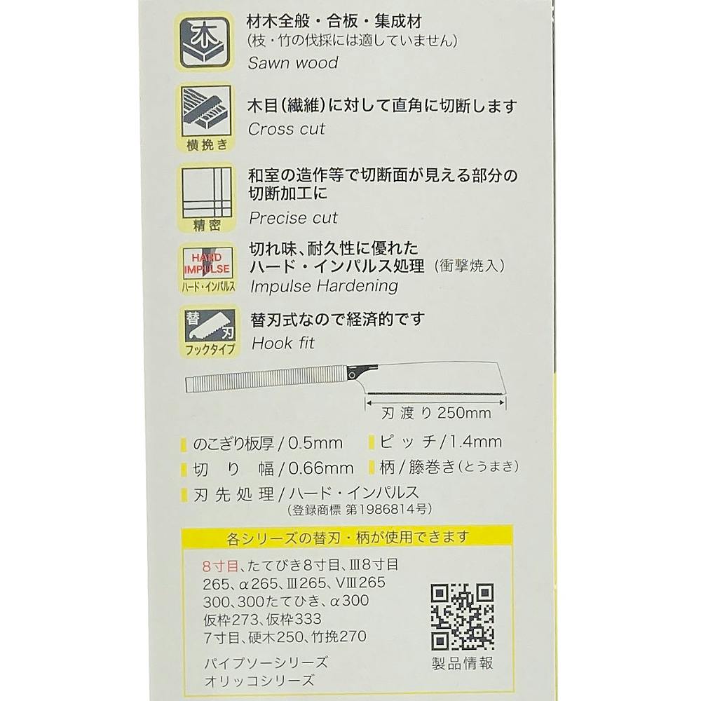 各シリーズの替刃・柄が使用できます/8寸目、たてびき8寸目、III8寸目、265、α265、III265、VIII265、300、300たてひき、α300、仮枠273、仮枠333、7寸目、硬木250、竹挽270、パイプソーシリーズ、オリッコシリーズ