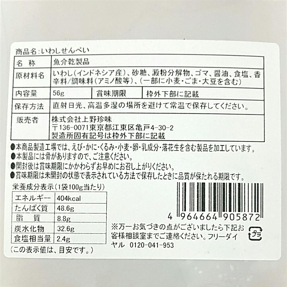いわし(インドネシア産又はミャンマー産又はベトナム産)、砂糖、澱粉分解物、ゴマ、醤油、食塩、香辛料/調味料(アミノ酸等)、(一部に小麦・ごまを含む)