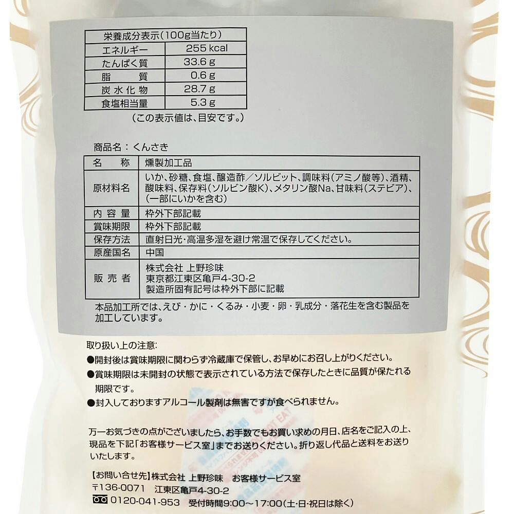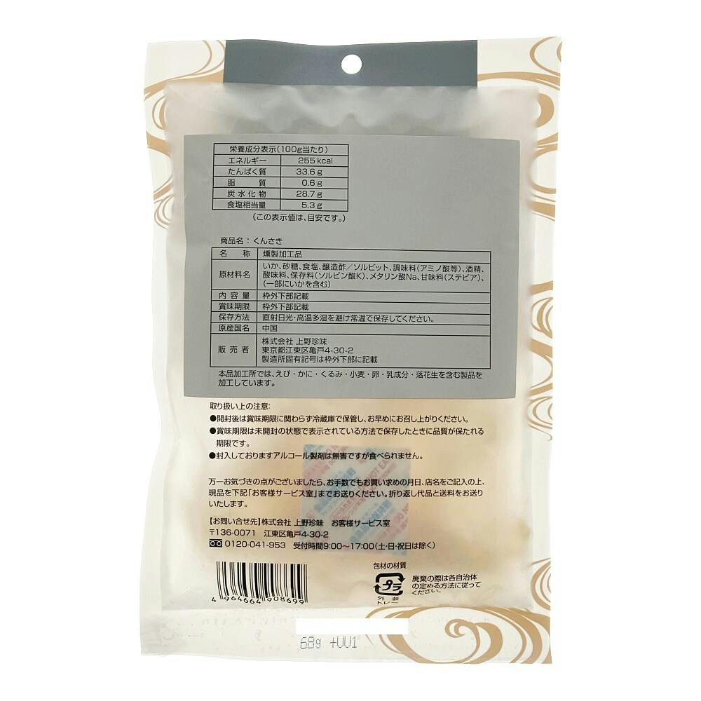 いか、砂糖、食塩、醸造酢/ソルビット、調味料(アミノ酸等)、酒精、酸味料、保存料(ソルビン酸K)、メタリン酸Na、甘味料(ステビア)、(一部にいかを含む)
