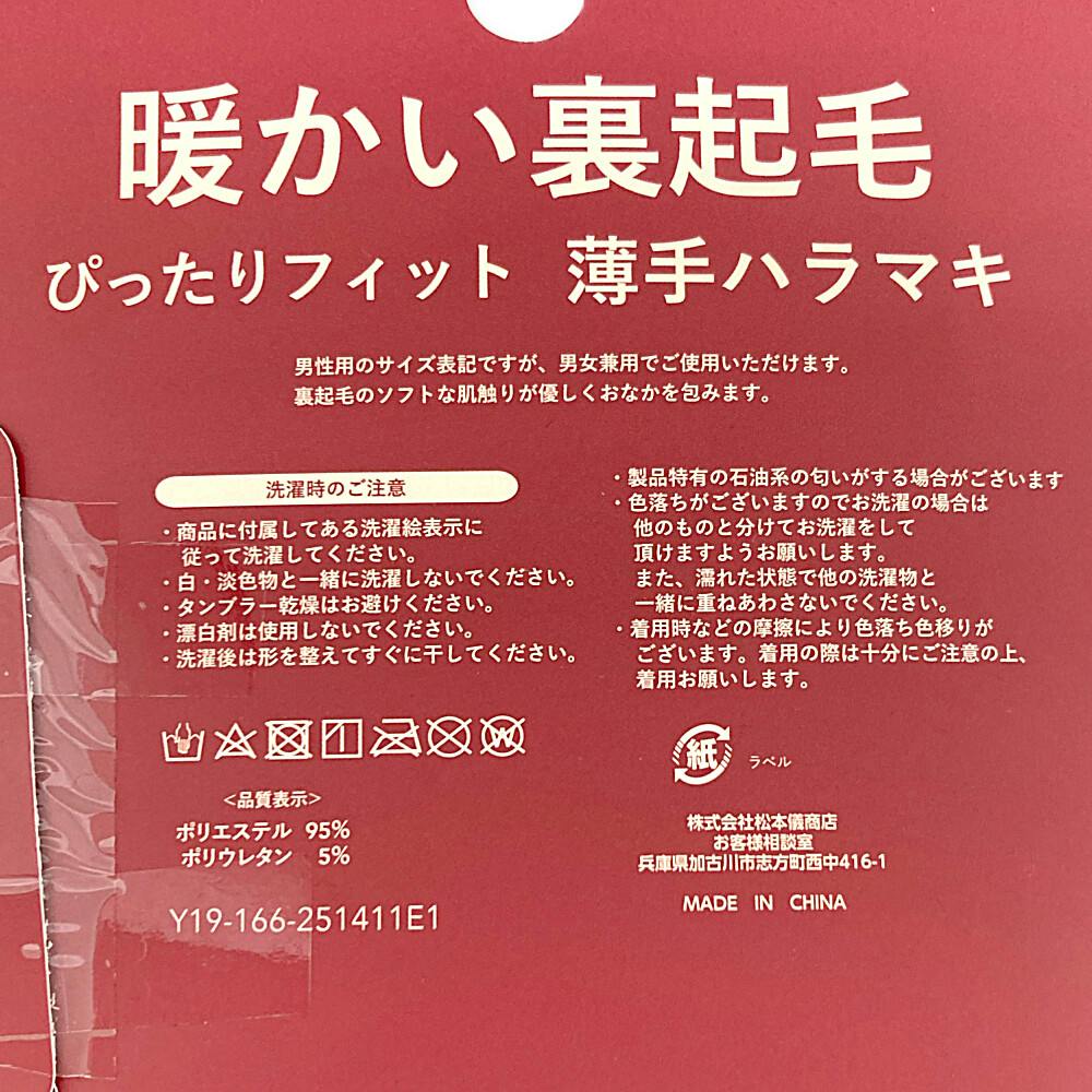 暖かい裏起毛 薄手ハラマキ 黒 M 1枚入