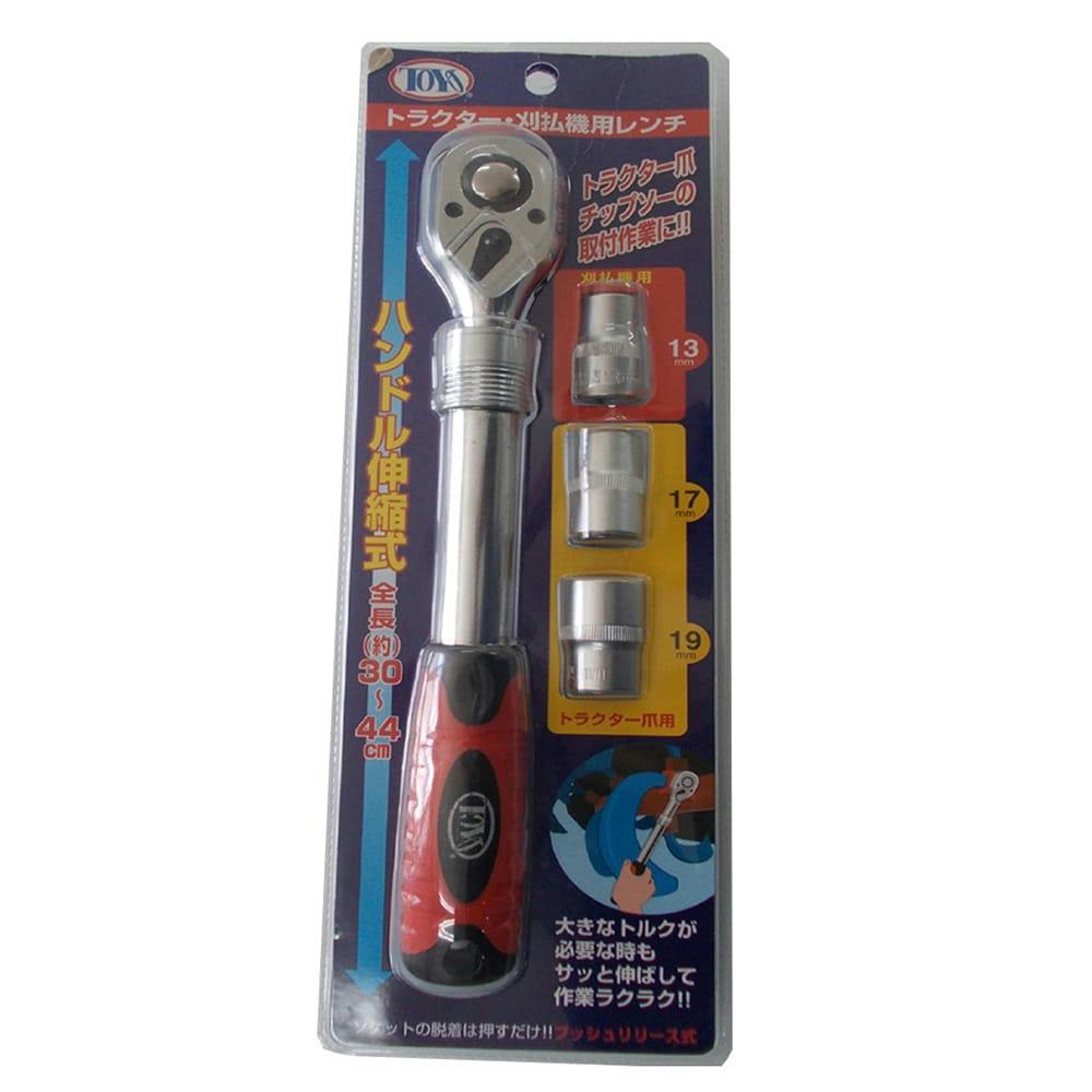 ●ハンドル伸縮式で全長約30~44cm●13ミリの刈払機用、17、19ミリのトラクター用ソケット付。