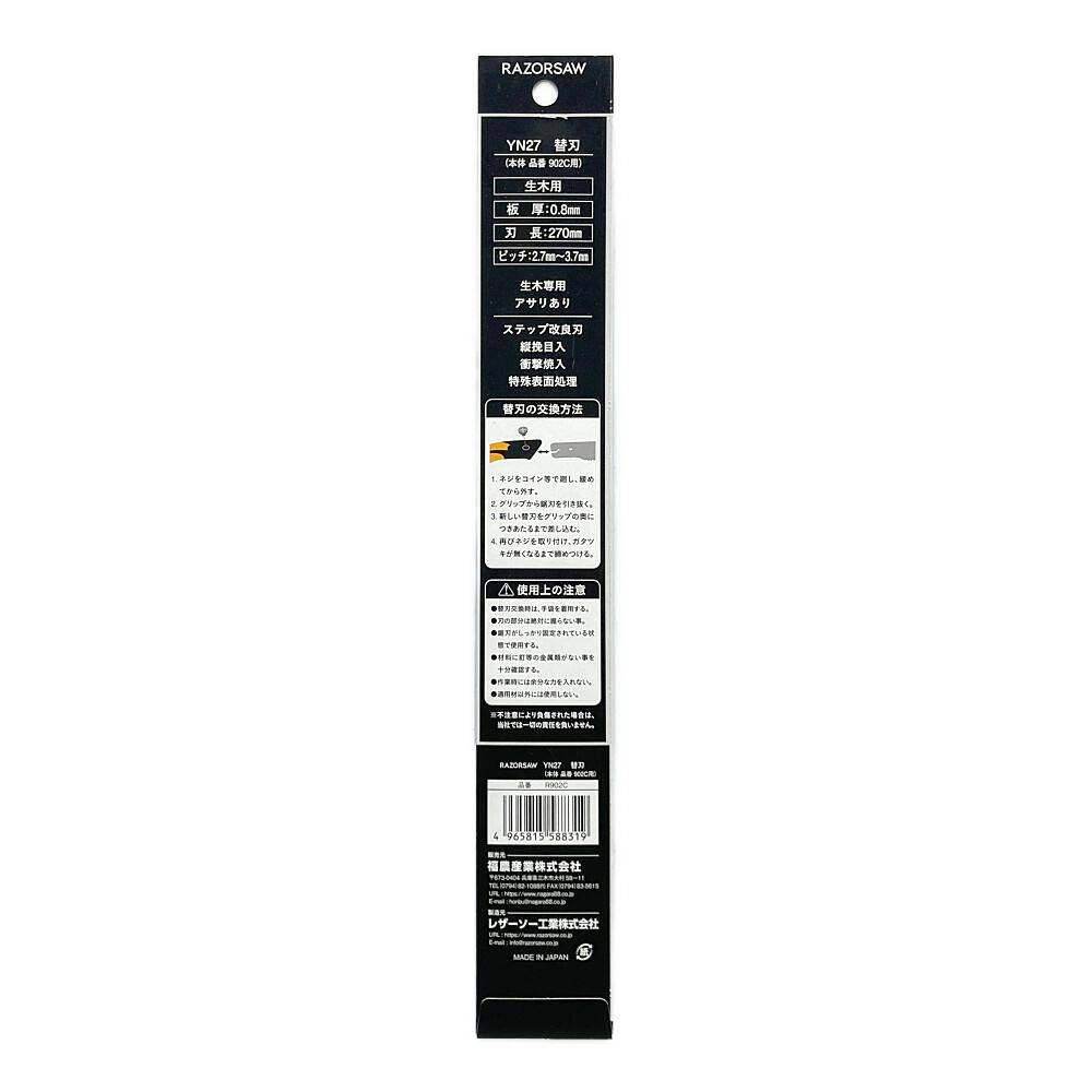 ●YN27替刃(本体品番902C用)●板厚:0.8mm●ピッチ:2.7~3.7mm●生木用●アサリあり●ステップ改良刃●縦挽目入●衝撃焼入●特殊表面処理●1枚入り