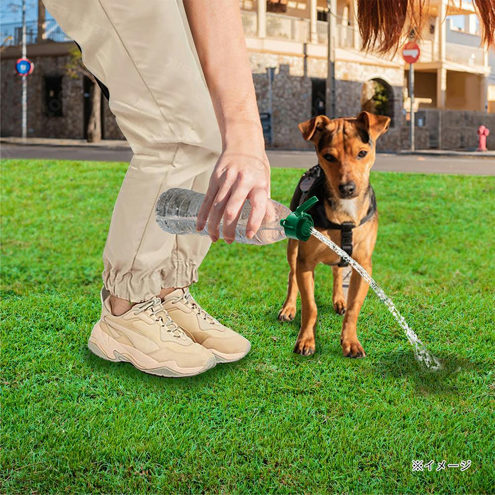 市販のペットボトル(別売り)に取り付けて、お出かけ中の水飲みや、おしっこ跡の洗浄にご使用ください。