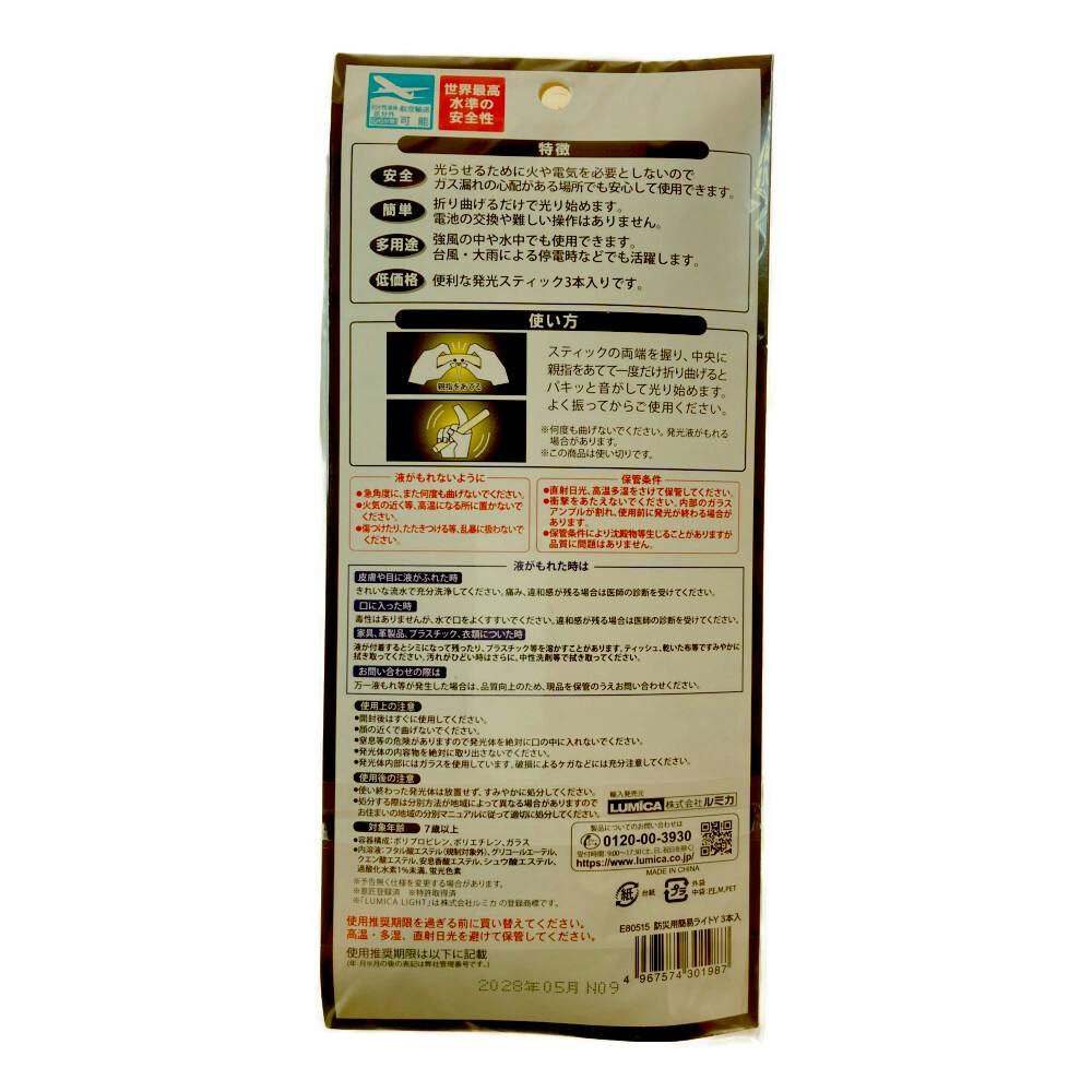 ●スティックの両端を握り、中央に親指をあてて一度だけ折り曲げるとパキッと音がして光り始めます。●よく振ってからご使用ください。