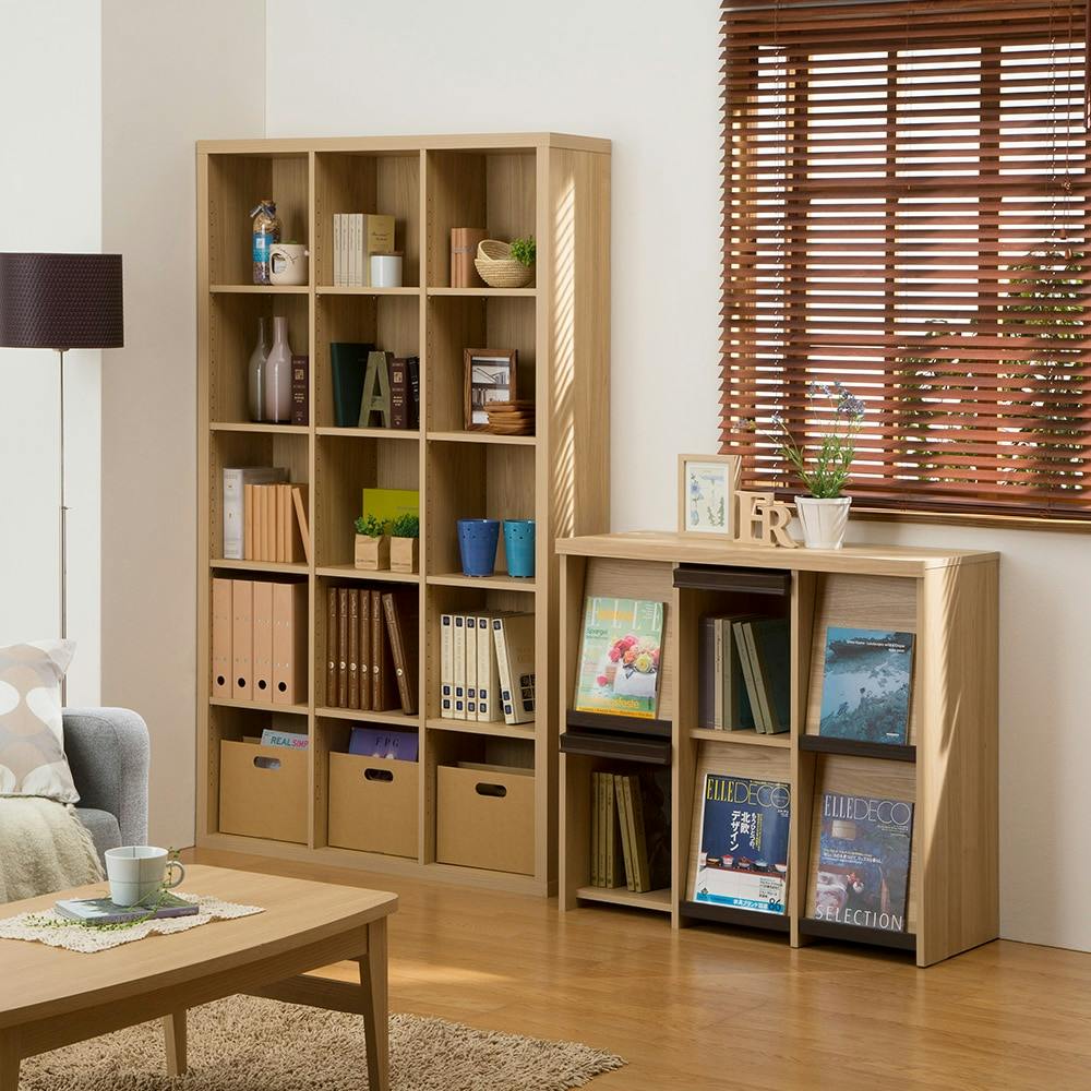 ●厚板のどっしりとした重厚感の中にマス目の整然とした美しさが光るシンプルさが魅力。 ●フラップ扉には大型の木製引手。ダークなアクセントカラーが全体を引き締めます。