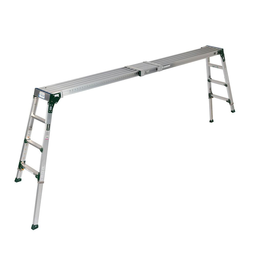 ●作業スペースに合わせて調整できる伸縮天板・伸縮脚付足場台●脚伸縮幅:395mm●伸縮脚は6mmピッチで調節可能