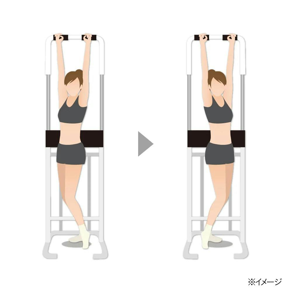 日常生活で常にカラダは疲れています。ぶらさがるだけで全身を しっかり伸ばすことができます。日ごろ、固くなっ た筋肉をストレッチ、カラダの柔軟性をを回復させ ます。背すじがしっかり伸びるので、スッキリと した姿勢を目指せます。