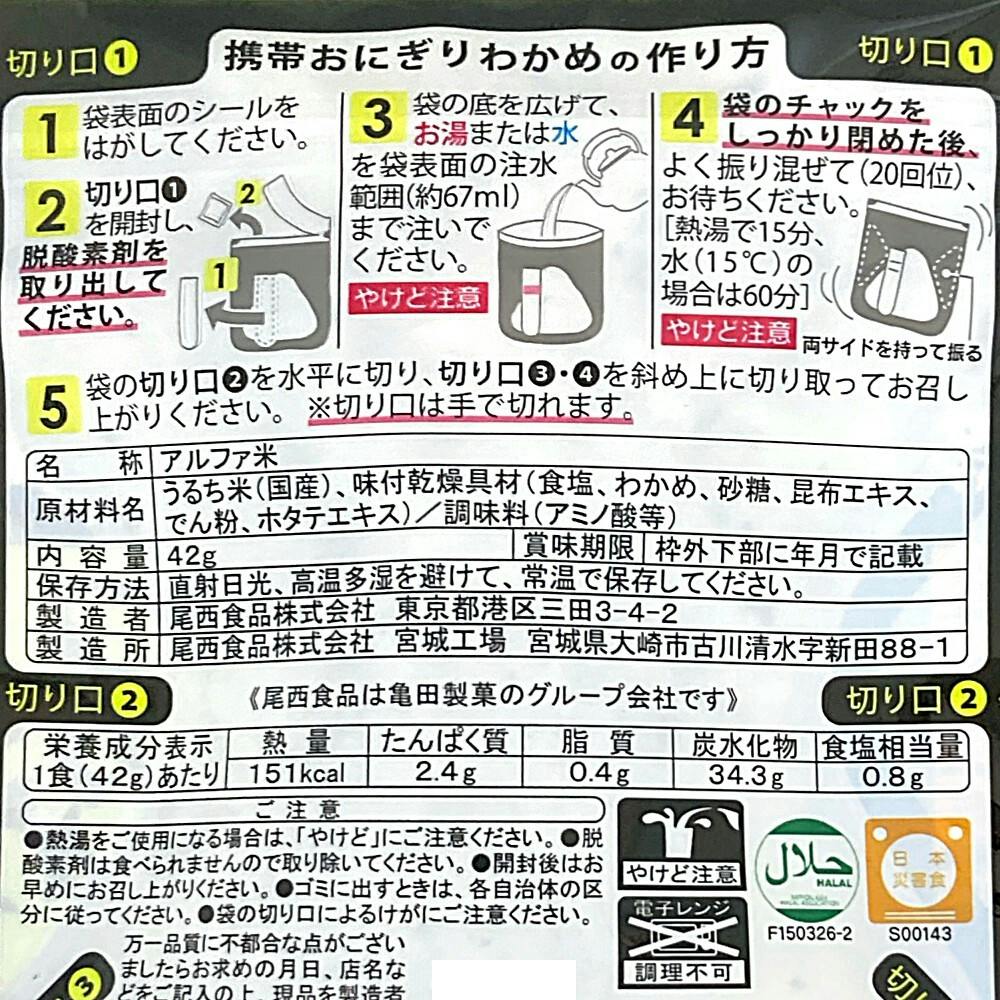 お湯又は水を入れるだけで具材の旨みがギュッとおいしい三角形のおにぎりが出来上がります。手を汚さずに食べられる3点カット方式。携帯性抜群!できあがり量109g。100%国産米を使用。アレルギー物質(特定原材料等)不使用