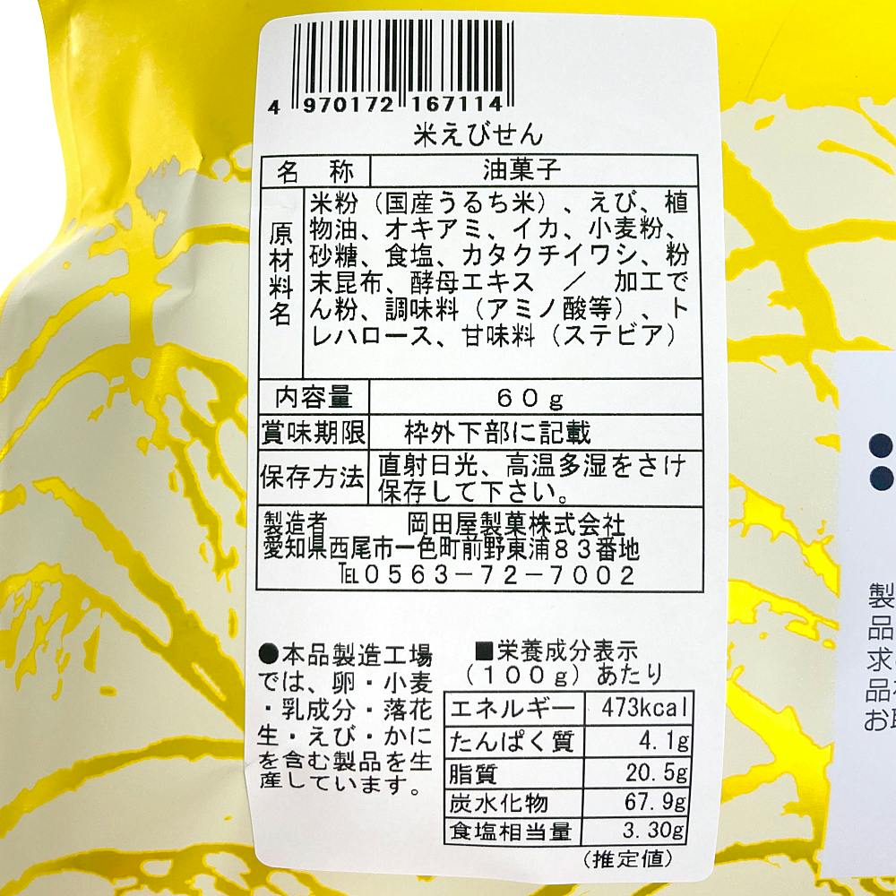 米粉(国産うるち米)、えび、植物油、オキアミ、イカ、小麦粉、砂糖、食塩、カタクチイワシ、粉末昆布、酵母エキス/加工でん粉、調味料(アミノ酸等)、トレハロース、甘味料(ステビア)