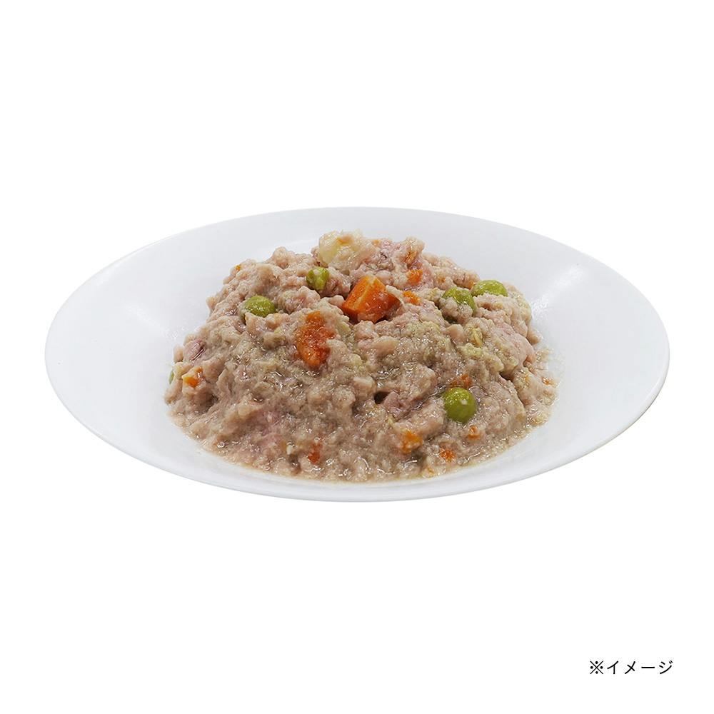 鶏肉と鶏ささみに食物繊維を含む野菜(じゃがいも、人参、グリンピース)を加え、食べやすいミンチ状に仕上げました。