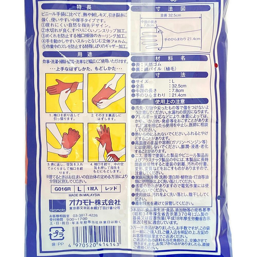 ●Lサイズ●疲れにくい自然な指先デザイン。●水切れが良く、すべりにくいノンスリップ加工。●めくれを防止する袖口補強のカーリング加工。●手を動かしやすいスルッとなじむ立体フォルム。●作業中のズレを防止する特殊しぼりのギャザー加工。