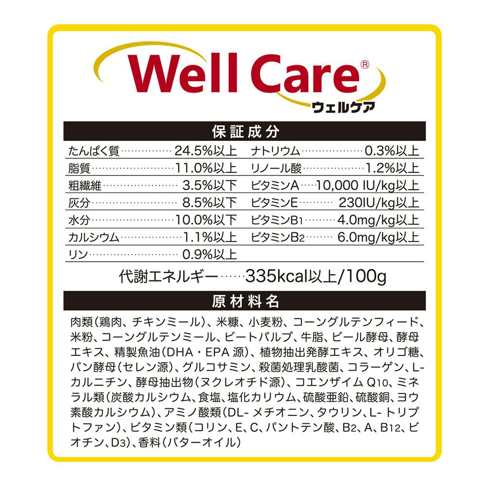 たんぱく質…24.5%以上、脂質…11.0%以上、粗繊維…3.5%以下、灰分…8.5%以下、水分…10.0%以下、カルシウム…1.1%以上、リン…0.9%以上、ナトリウム…0.3%以上、リノール酸…1.2%以上